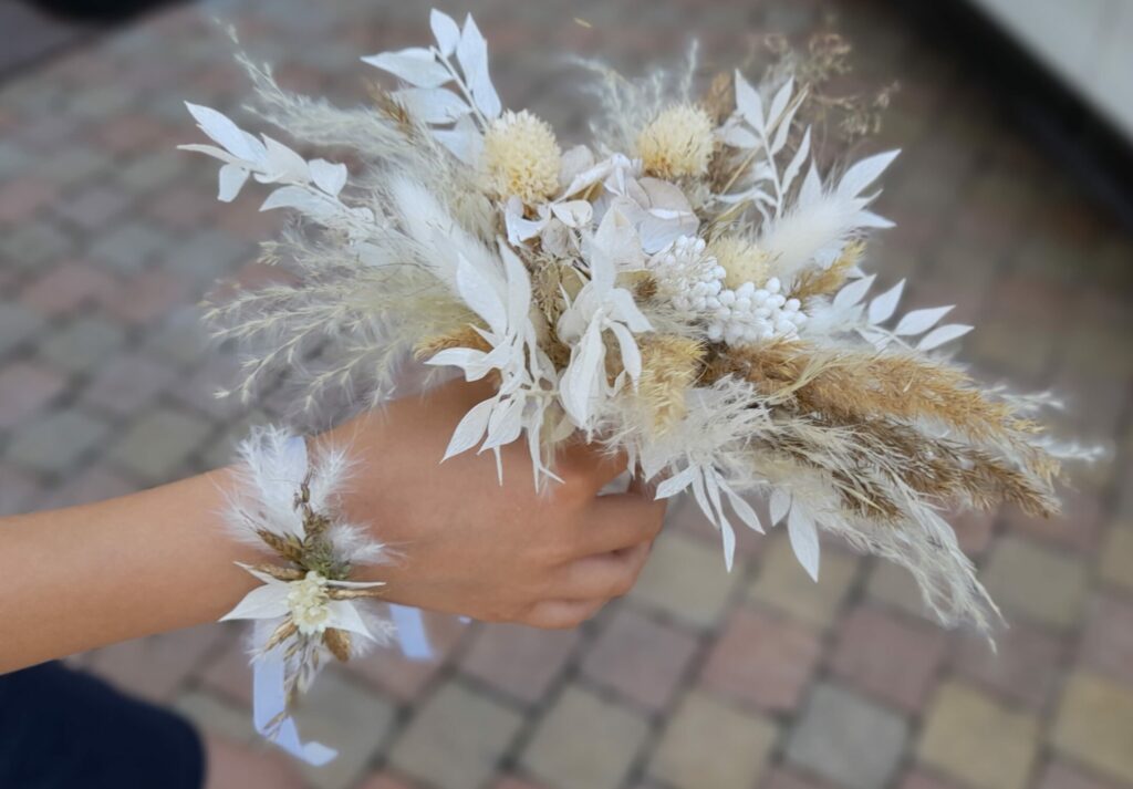 Un bouquet de mariage à base de fleurs séchées dans les tons blancs et naturel, associant ruscus, pampa et phalaris.