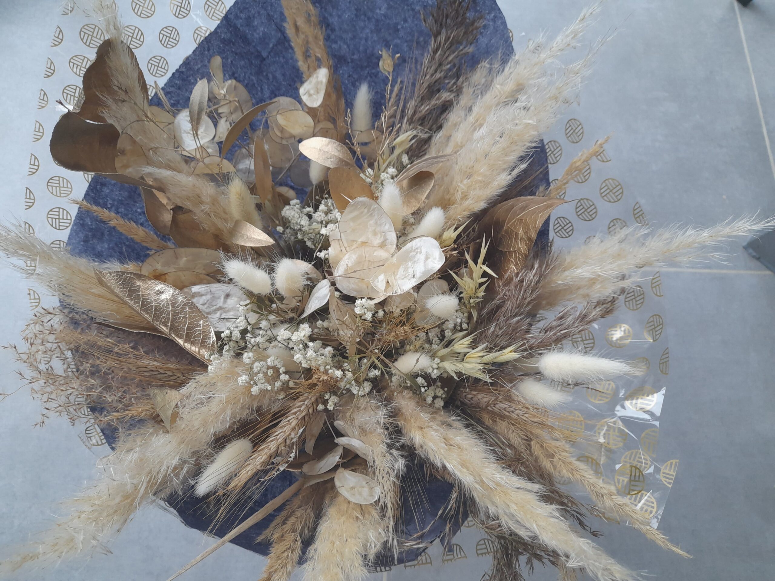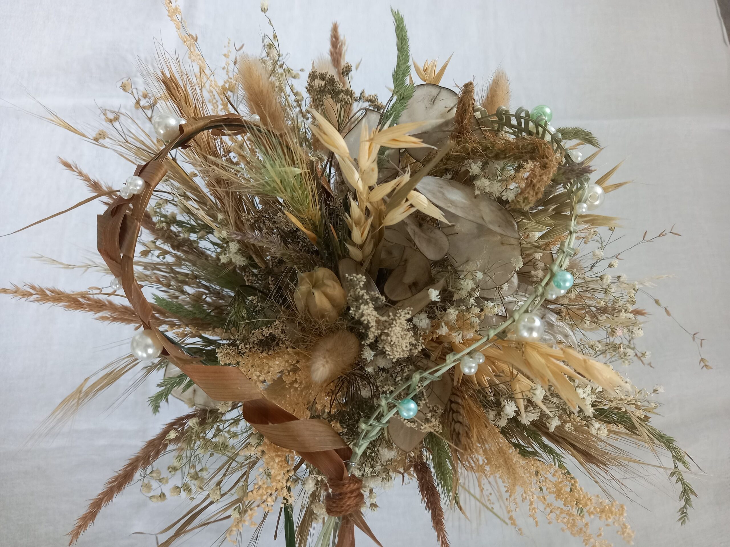 Un bouquet qui mêle gomphrena golosa, gypsophile, monnaie du pape, blé et la légèreté de la pampa.