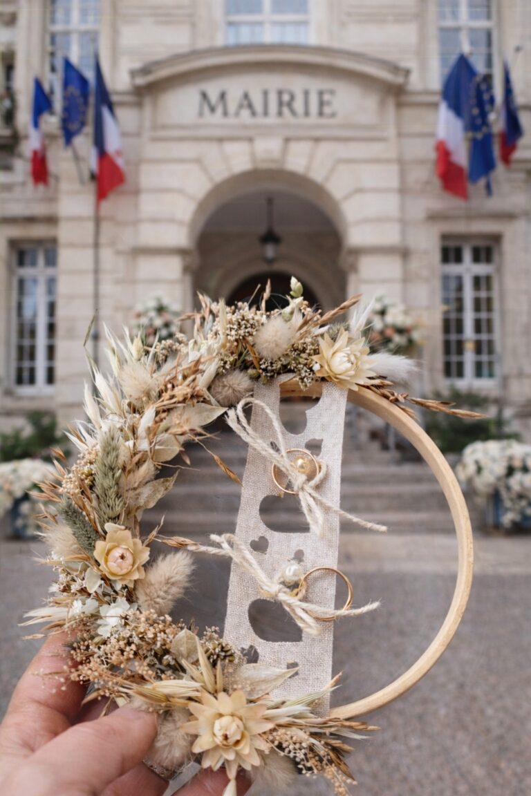 Le porte-alliance se fait décorer à accrocher, une fois la cérémonie terminée : il suffit de couper les liens en ficelle !